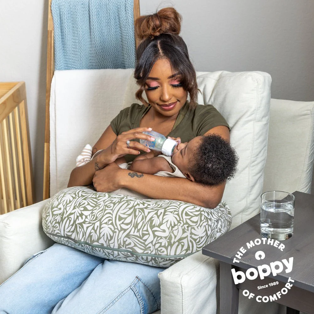 The beloved Boppy Nursing Pillow provides ergonomic support for every mealtime moment with a soft, organic cotton cover. The extra thick cushion lifts baby higher for a better latch, and stays supportive throughout your feeding journey. The hypoallergenic fiber fill and extra wide opening makes for a flexible fit for more body types and multiple feeding holds.